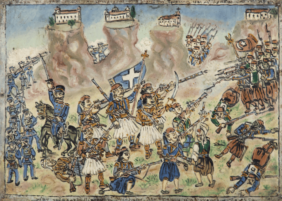 The modern Greek art auction mentioned above includes paintings by Theofilos Chatzimihail, a self-taught folk artist who wandered around early 20th-century Greece painting on taverna walls, shop signs, and whatever surfaces people would let him decorate in exchange for food and shelter. Born near Mytilene in Lesvos, Theophilos dressed in traditional foustanella (the pleated Greek kilt), was considered eccentric bordering on unhinged by his contemporaries, and died in poverty in 1934 without ever selling a painting for actual money.